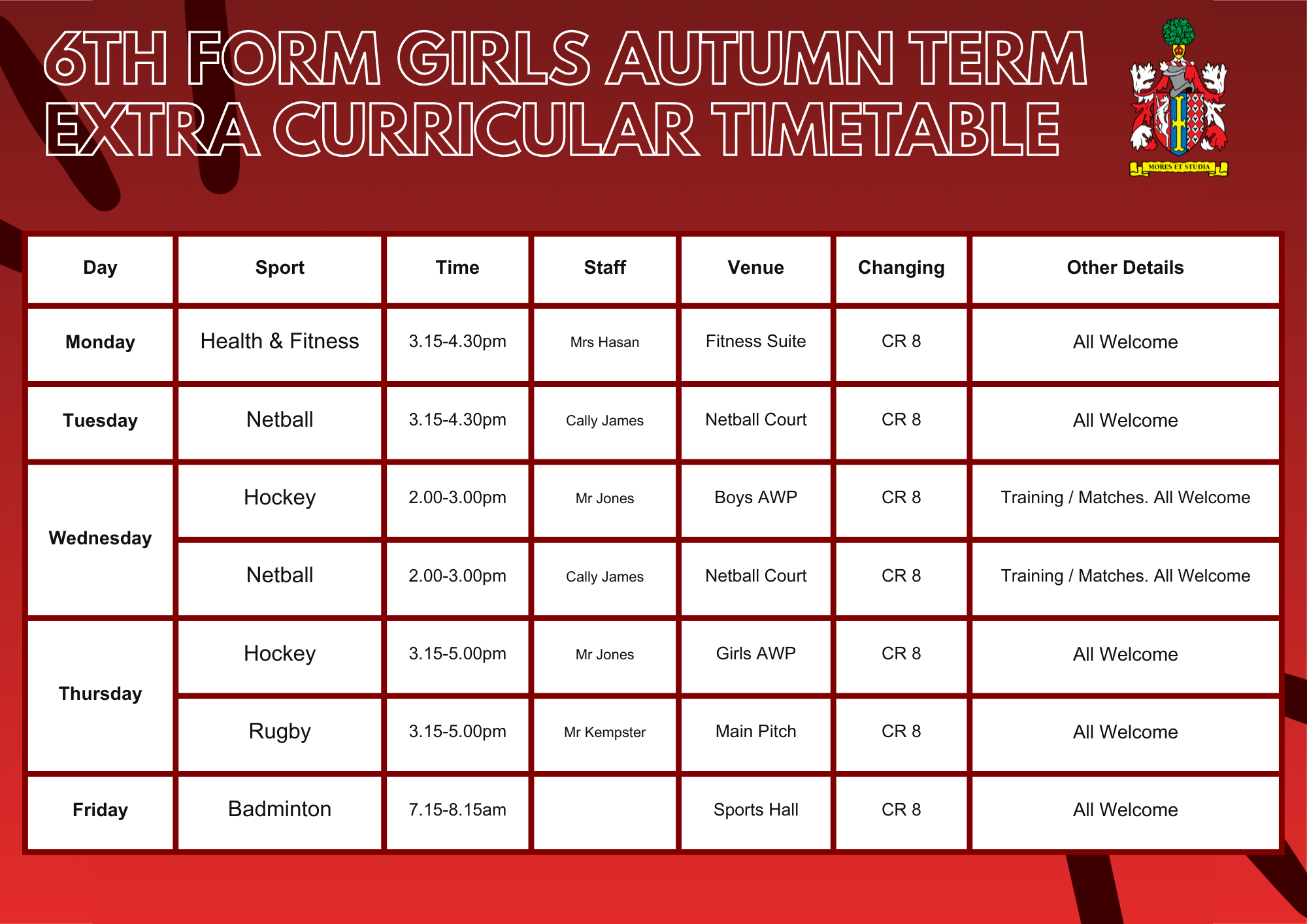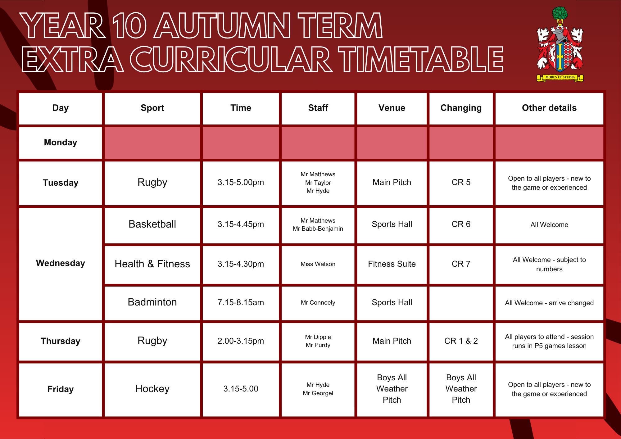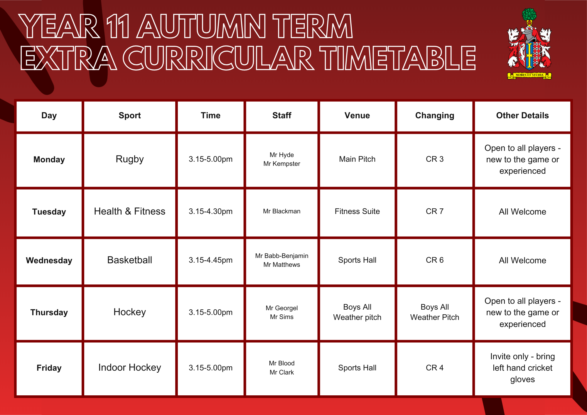 Main School Main School » Sport » Extra-Curricular Sports Timetable Extra-Curricular Sports Timetable Extra-Curricular Sports Timetable Sixth Form Boys Sixth Form Girls Year 11 Year 10 Year 9 Year 8 Year 7 Timetable Autumn 2025-26