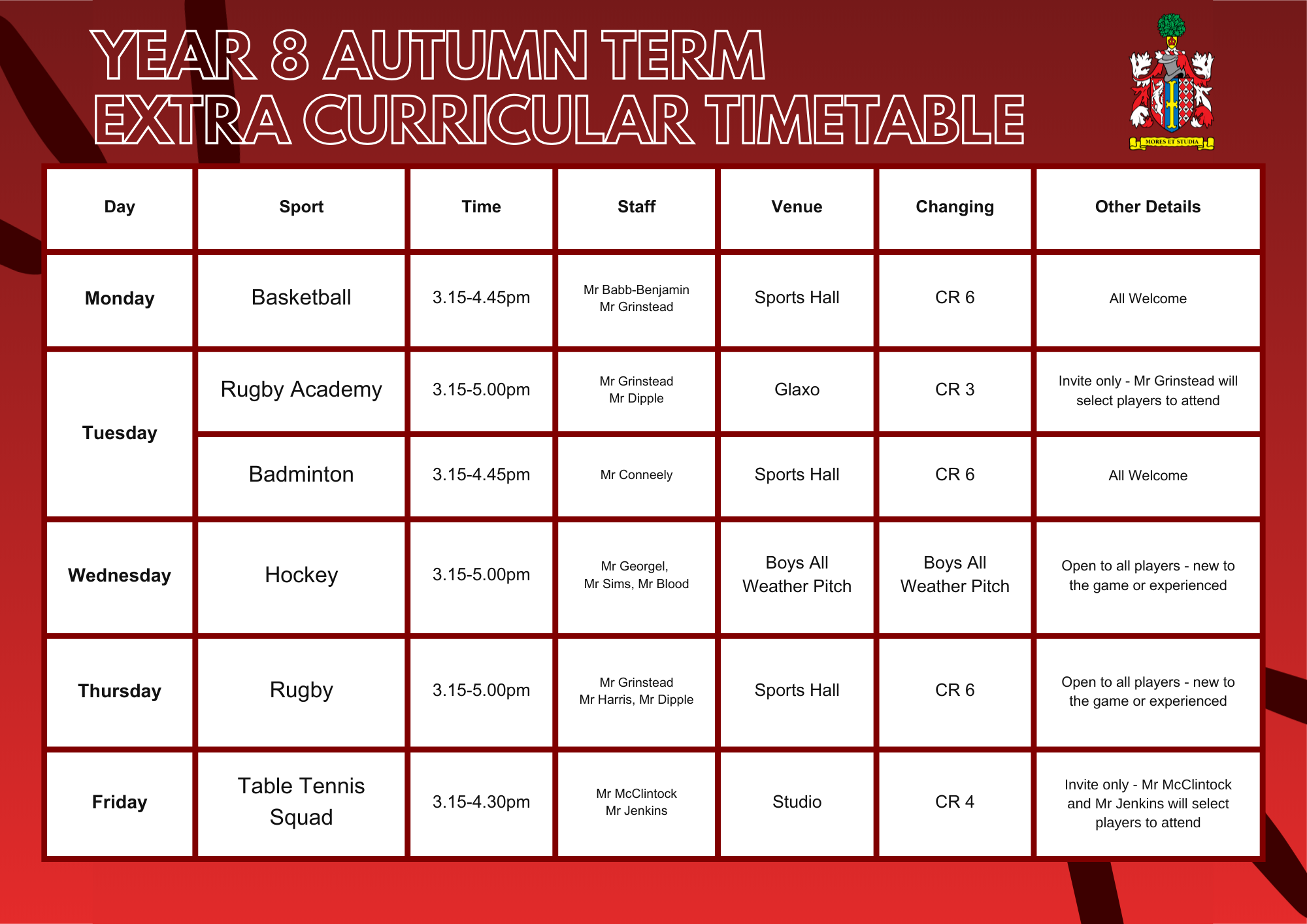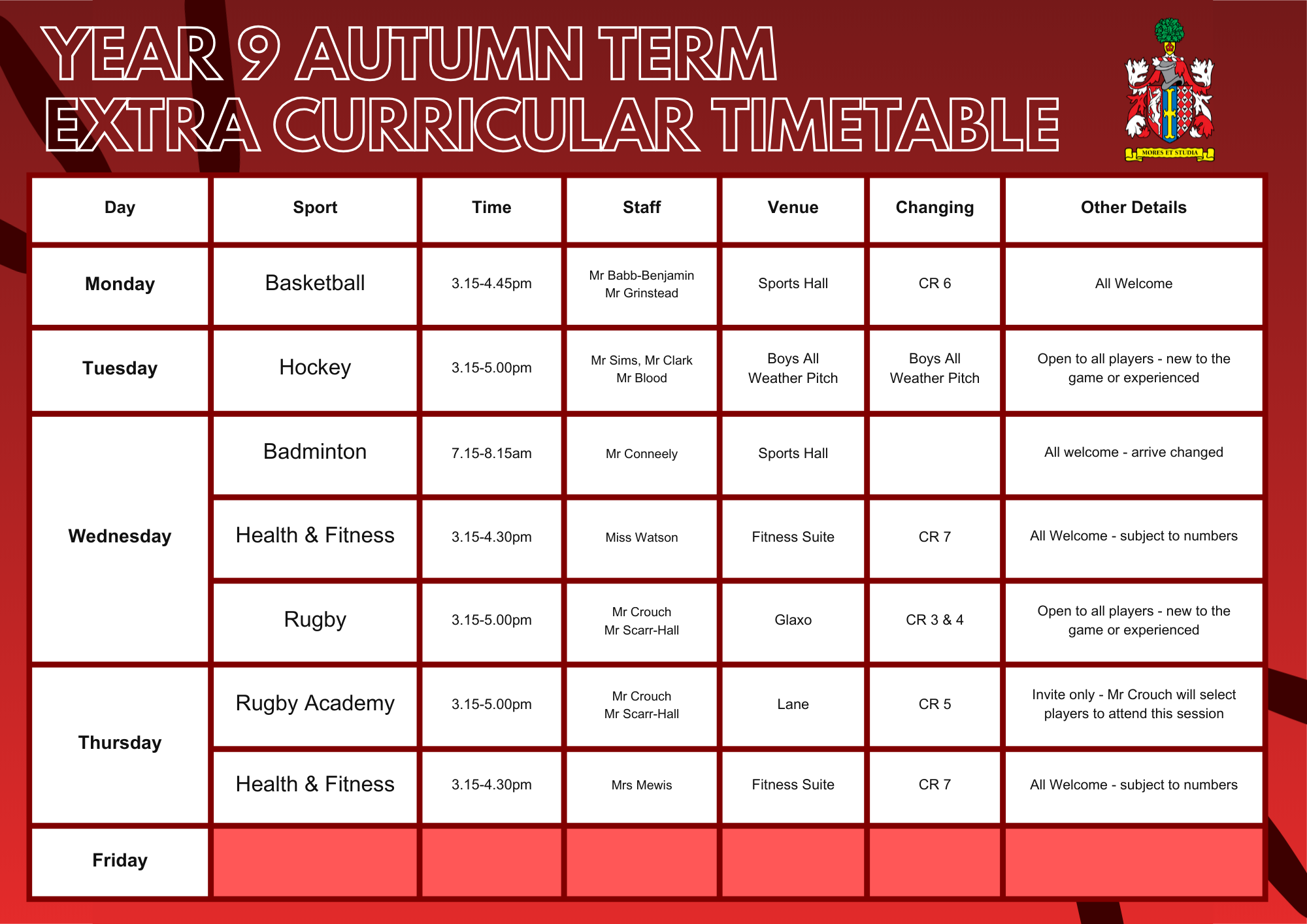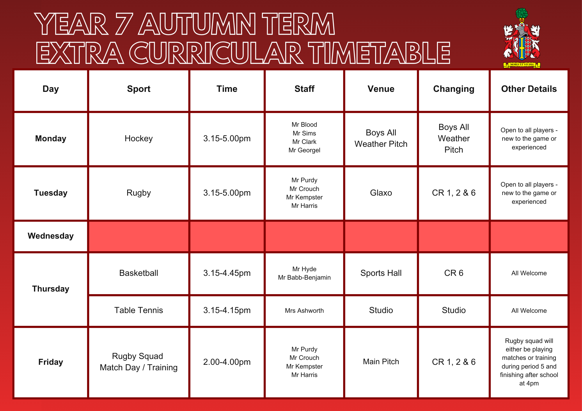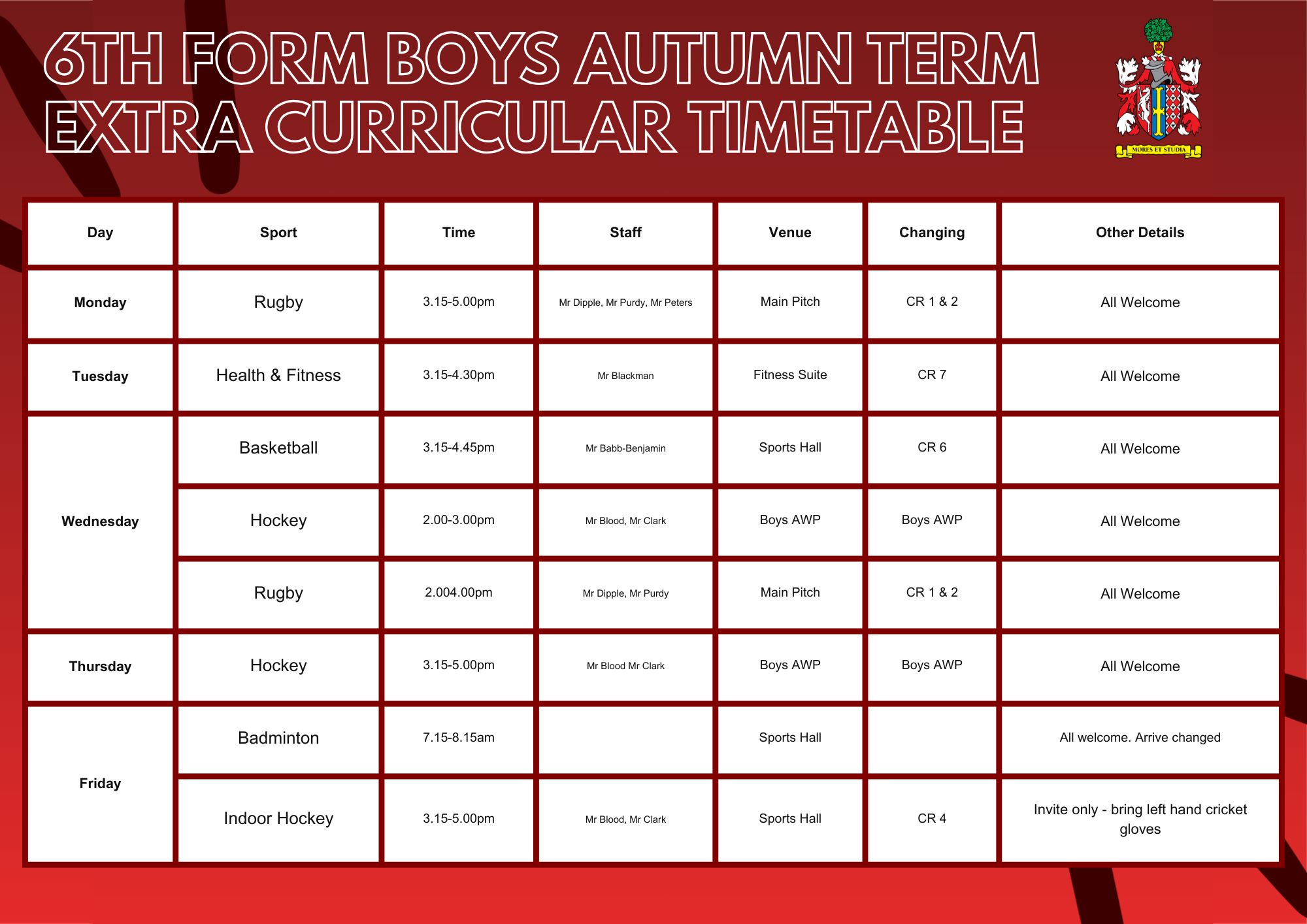 Main School Main School » Sport » Extra-Curricular Sports Timetable Extra-Curricular Sports Timetable Extra-Curricular Sports Timetable Sixth Form Boys Sixth Form Girls Year 11 Year 10 Year 9 Year 8 Year 7 Timetable Autumn 2025-26